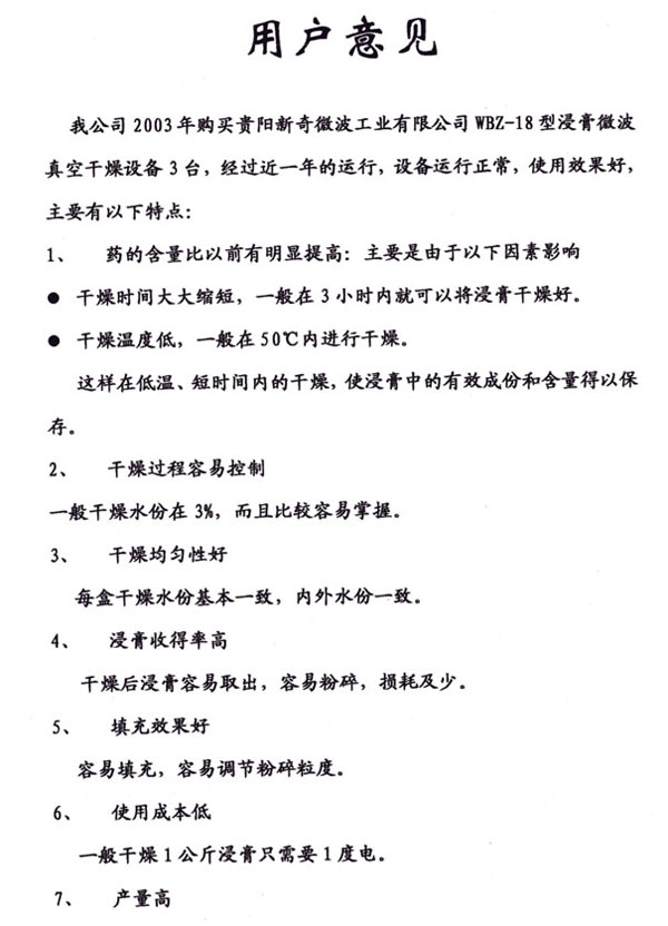 2006年8月,遼寧好護(hù)士藥業(yè)考察微波真空干燥機(jī),為了能購買到理想的設(shè)備,他們將同一種浸膏發(fā)到上海、江蘇、廣州、貴陽的設(shè)備廠家,每個(gè)廠家發(fā)300公斤浸膏,派副總、車間主任、設(shè)備主任共4人組成的考察人員,現(xiàn)場(chǎng)進(jìn)行試驗(yàn),觀察設(shè)備運(yùn)行過程,全部廠家試驗(yàn)完畢后,他們選擇了新奇微波的靜態(tài)微波真空干燥機(jī),一次購買5臺(tái)。當(dāng)時(shí),有一個(gè)廠家提出先拿設(shè)備給他們用,他們沒有要,他們觀念很清楚, 不成熟的設(shè)備堅(jiān)決不要,不僅不能完成生產(chǎn)任務(wù),而且增大后期維護(hù)費(fèi)用,要買就要最好的,一年多來, 干燥藥的質(zhì)量高、產(chǎn)量大,確保企業(yè)生產(chǎn),設(shè)備一直正常連續(xù)運(yùn)行,證明了他們的正確選擇。